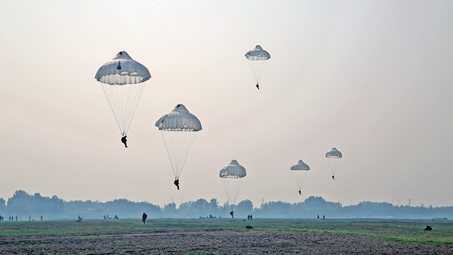 初冬,空降兵某旅组织跳伞训练。