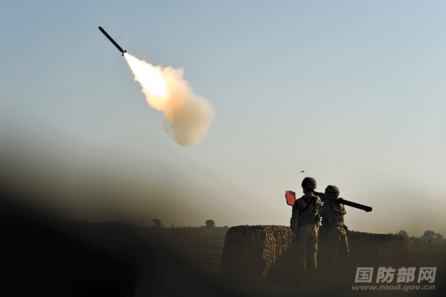 官兵使用某型便携式防空导弹对空中目标进行实弹射击。