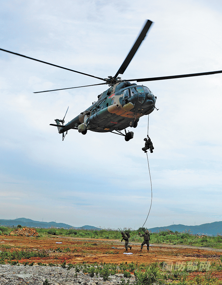 火力打击过后,数架运输直升机从不同方向突入“战场”,快速实施索降和机降。着陆后,突击队员采取多路并进方式,对“敌”残余力量展开围剿。