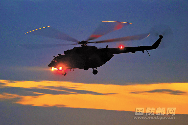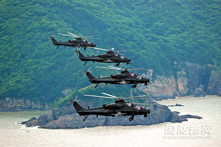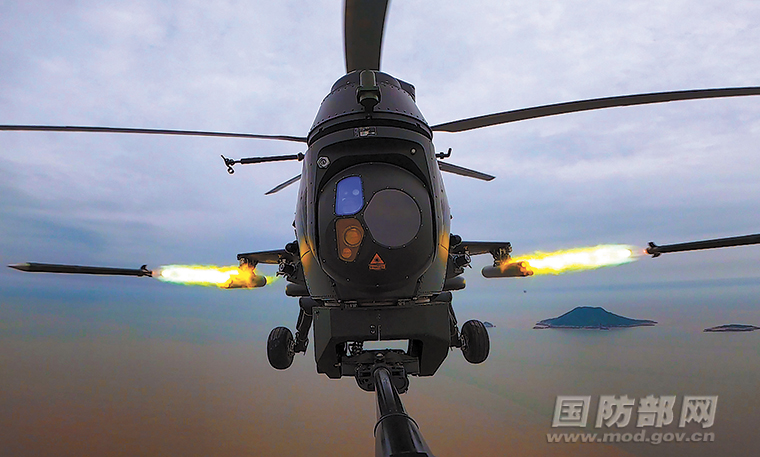 塔台下达起飞指令后,数架武装直升机接续升空,快速完成战斗编组。飞行途中,战机根据战场情况不断变换战斗队形,时而低空掠海飞行,时而借助地形隐蔽突防。