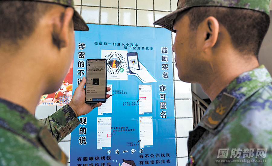 不久后,营里为收集意见建议设立开通了“意见码”。官兵只要扫一扫“意见码”,就可以匿名发表意见建议。