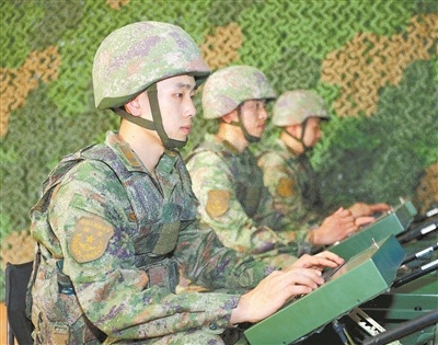 官兵在模拟机上操作训练。