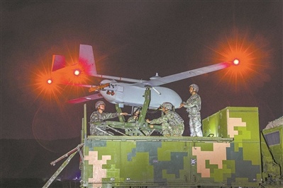 夜幕降临,无人机完成任务后顺利返航回收。不久,另一架次无人机点火发射,展开新一轮训练……