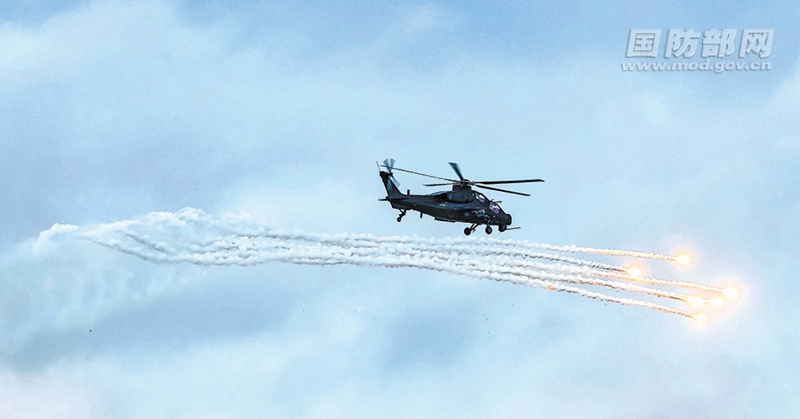 图为直升机发射干扰弹。解放军报特约通讯员 石芝鹏摄