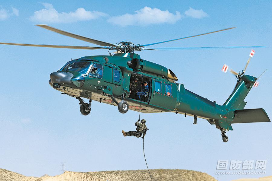 图为战士从直升机上索降。汪源 摄