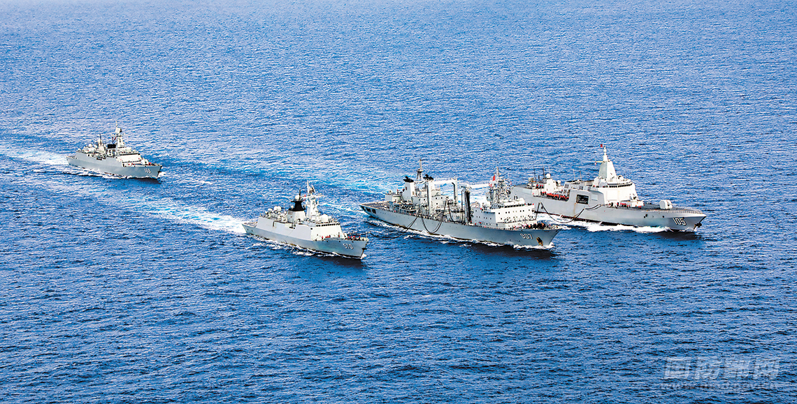 盛夏时节,海军某部多艘舰艇组成编队开展航行补给训练。吴 迪摄
