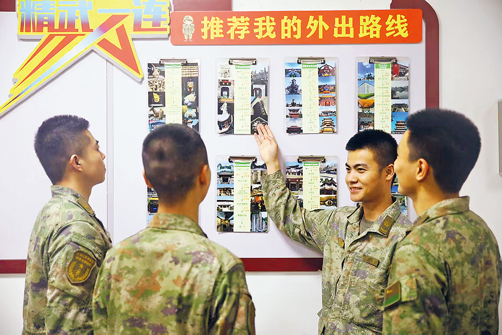 笔者在该部某连采访时看到,走廊一块“推荐我的外出路线”展板上,贴满了该连军士休息日的外出计划和“打卡”照片,“春日环湖骑行路线”“文化博物馆打卡路线”“红色场馆参观路线”“寻访小巷美食攻略”“文人故居探访推荐”等内容,深受大家的欢迎和喜爱。