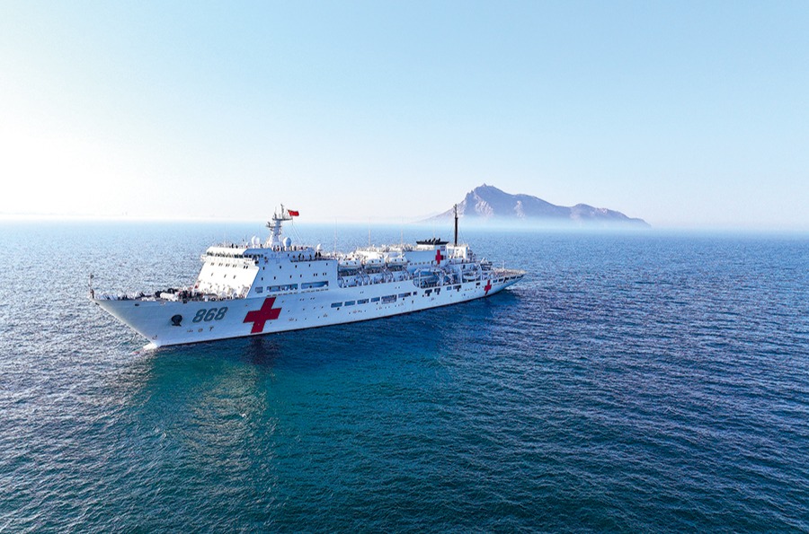 初夏黄海,波涛翻涌。一艘“大白船”破浪前行,洁白船身上的鲜红十字和“868”舷号,分外醒目。