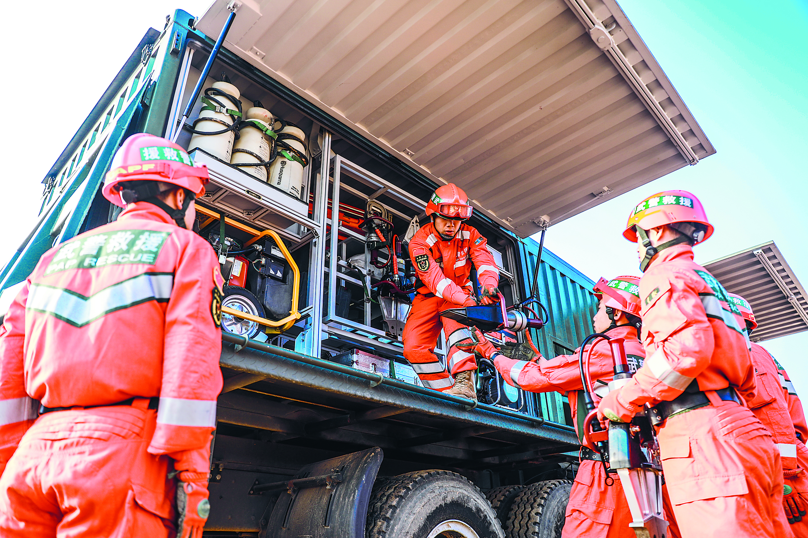 武警河北总队某支队工兵分队考核前领取装备器材。张凯 摄