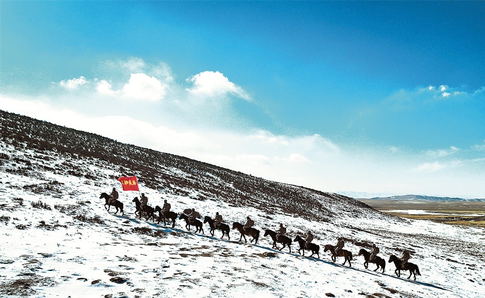 哨所官兵骑马踏雪巡逻。