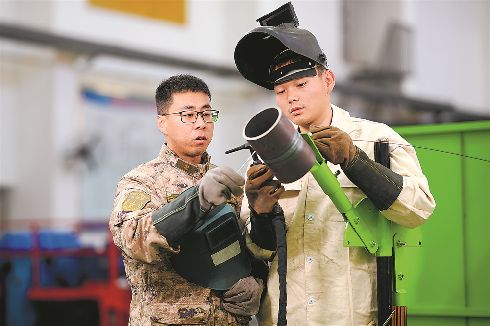 王江帆(左)正在向新同志传授焊接经验。刘明松摄