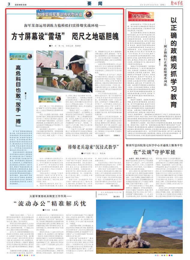 将“真实”雷场搬进模拟训练方舱,为高危险难科目开辟训练新路径;依托智能训练系统查漏补缺,加速提升官兵专业能力。海军某部推动军事训练转型升级的生动实践启示我们:解决备战打仗中的难点堵点问题,科技是最有力的武器之一,利用科技手段推动训练模式迭代升级大有可为。