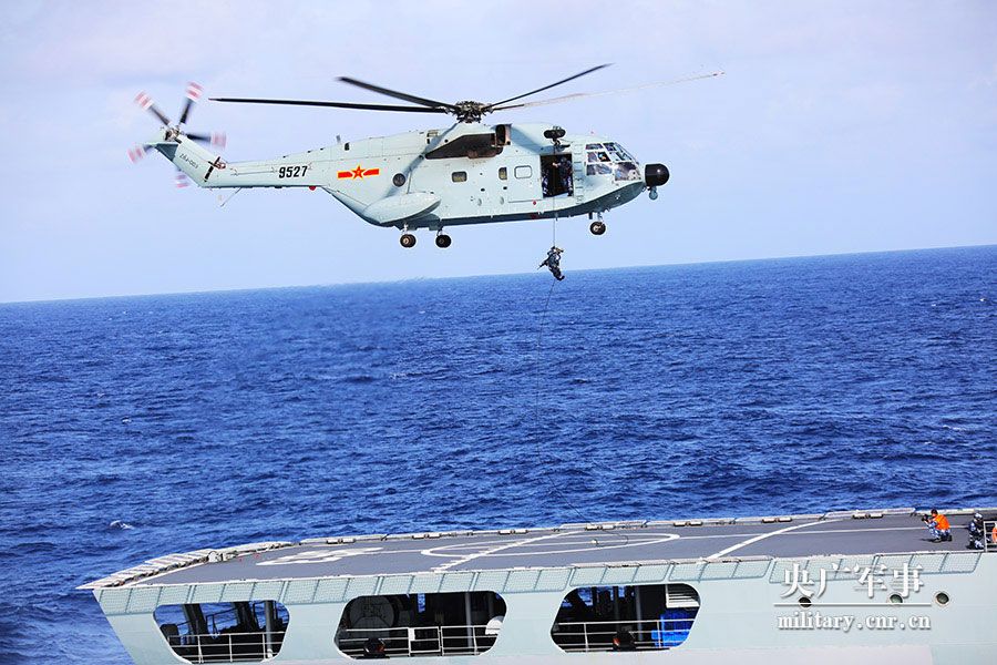 “直升机前出,准备对可疑商船实施登临检查!”行动命令下达后,长白山舰直升机搭载着十余名特战队员快速出击,在空中和舱面火力掩护下,迅速索降至可疑商船后甲板上。