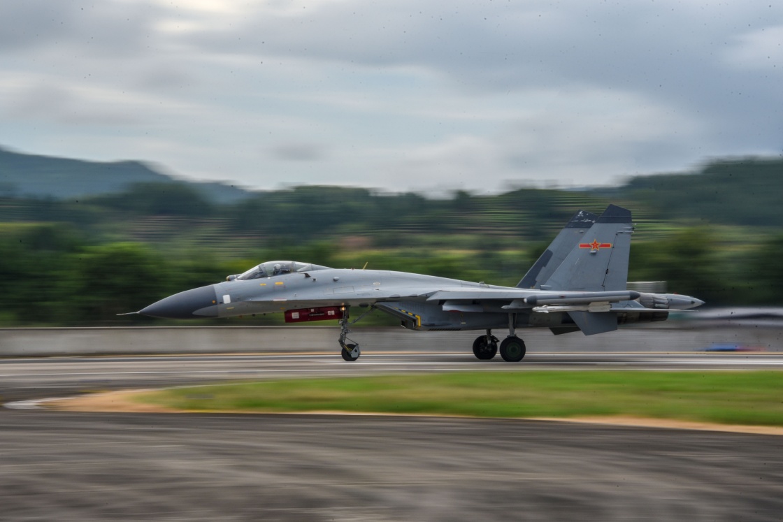 8月7日,中国人民解放军东部战区按计划,继续在台岛周边海空域进行实战化联合演训。这是战机正在加速,准备起飞。新华社发(付敢 摄)