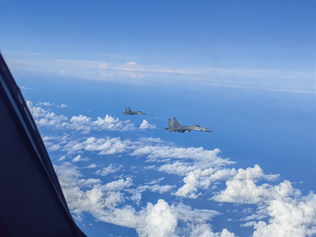 8月7日,中国人民解放军东部战区按计划,继续在台岛周边海空域进行实战化联合演训。这是战机正在进行编队飞行。新华社发(王新潮 摄)