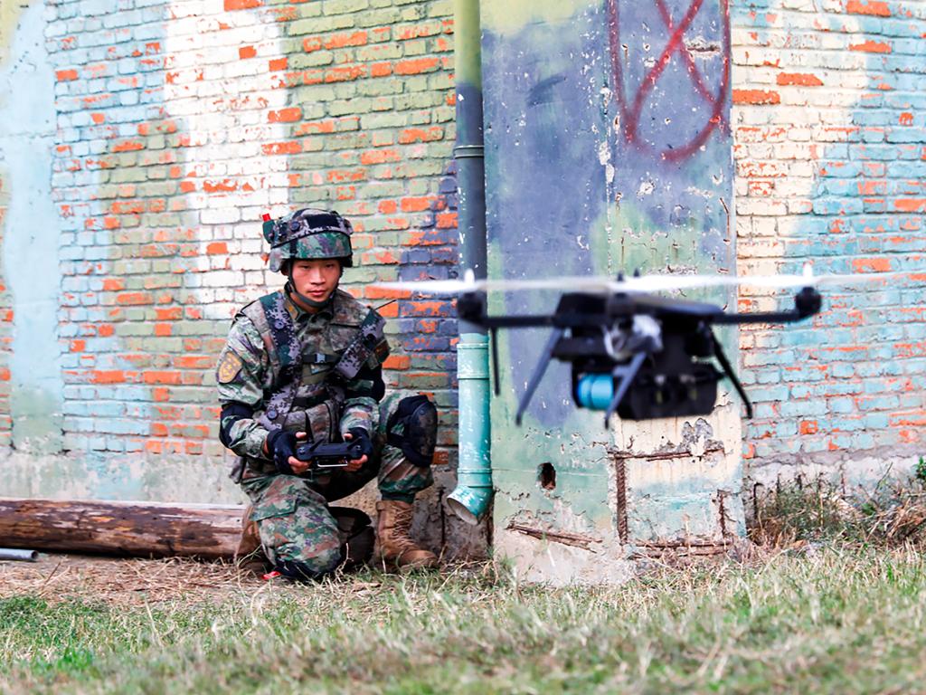 第71集团军“临汾旅”组织城镇攻防演练,无人机操作手使用无人机投掷烟雾弹(2022年11月21日摄)。新华社发(耿黎 摄)