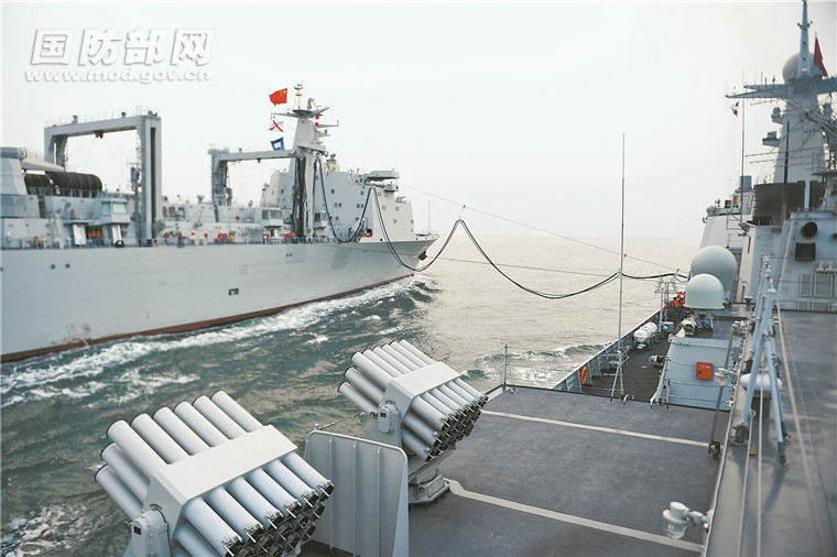 海军呼伦湖舰与乌鲁木齐舰进行横向补给训练