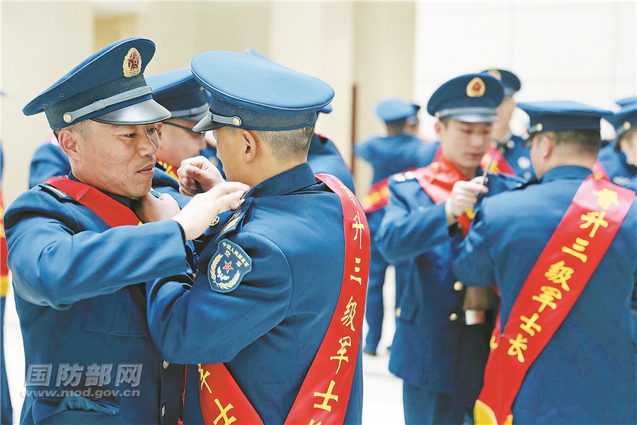 两会前夕,东部战区空军举行隆重仪式,为145名晋升军衔的高级士官颁发命令状,激励广大士兵爱岗敬业、奋发有为,不断强化建设一流过硬部队的使命担当。晋升大会召开前,高级士官们相互认真整理仪容仪表,兴奋之情溢于言表。邵统忠摄影报道