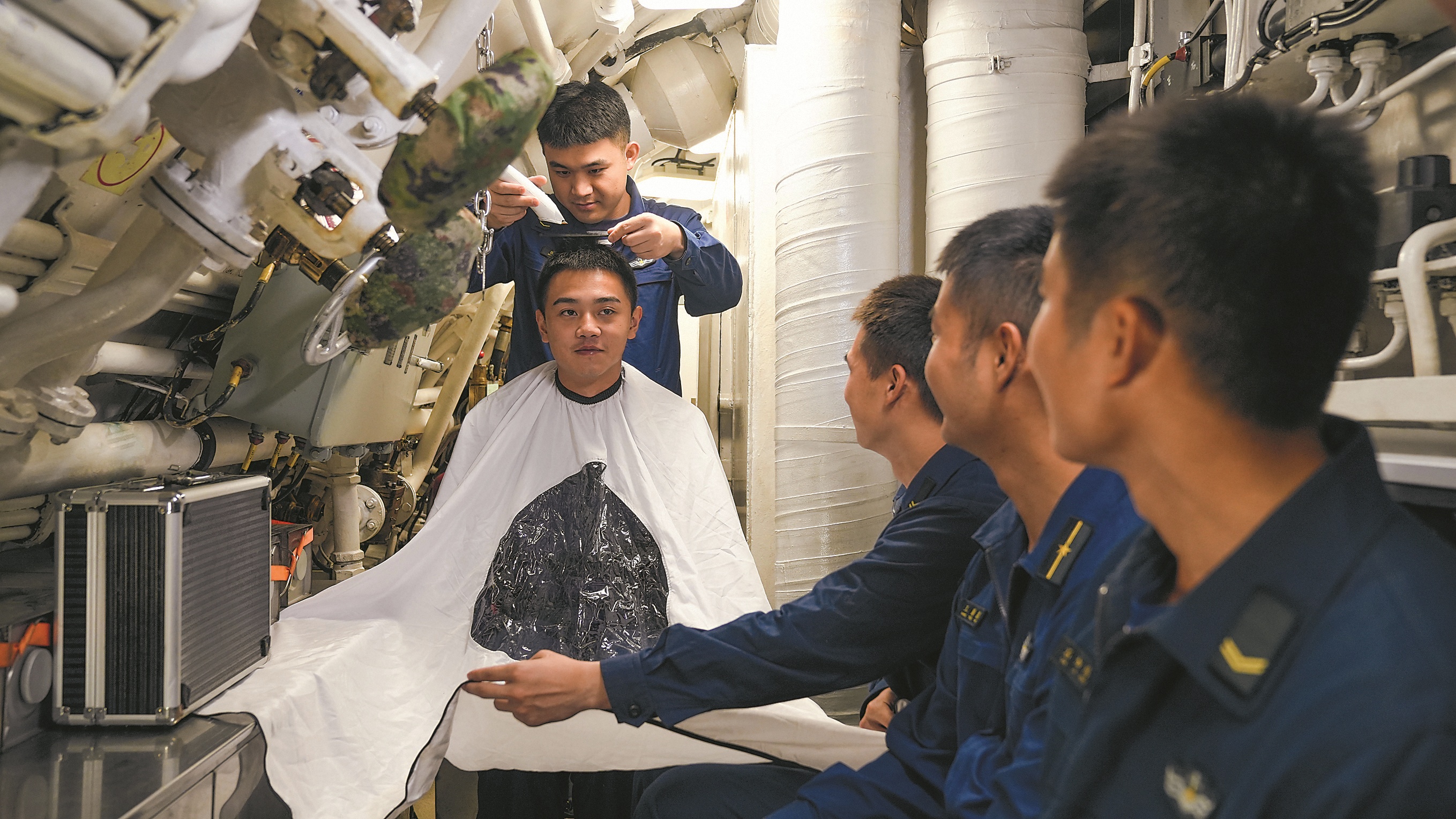 任务告一段落。屈指算来,距出海执行任务已过去数十天。休整期间,紧张气氛有所缓和,官兵们开始有时间放松,潜艇一角的“龙宫”理发店再次“营业”,该艇空调技师、理发员老姜又忙碌起来。