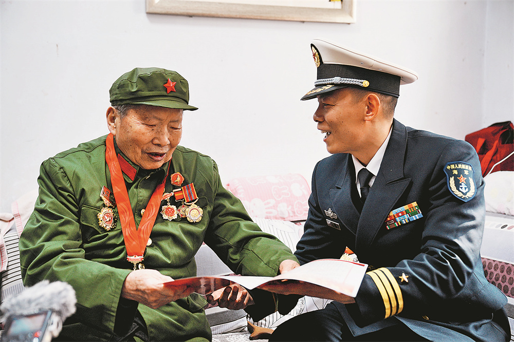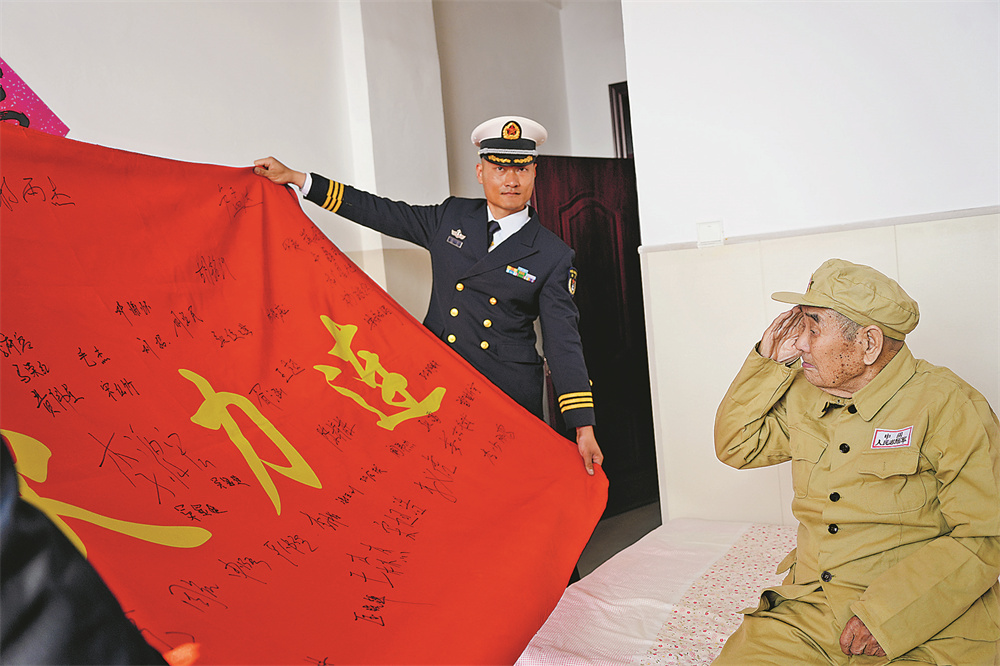 “前辈您好,我是火力连现任指导员……”见到97岁高龄的抗美援朝老兵吴显进,海军某部火力连指导员张京庄重地敬了一个军礼。吴显进颤颤巍巍地抬起右手,郑重回礼。