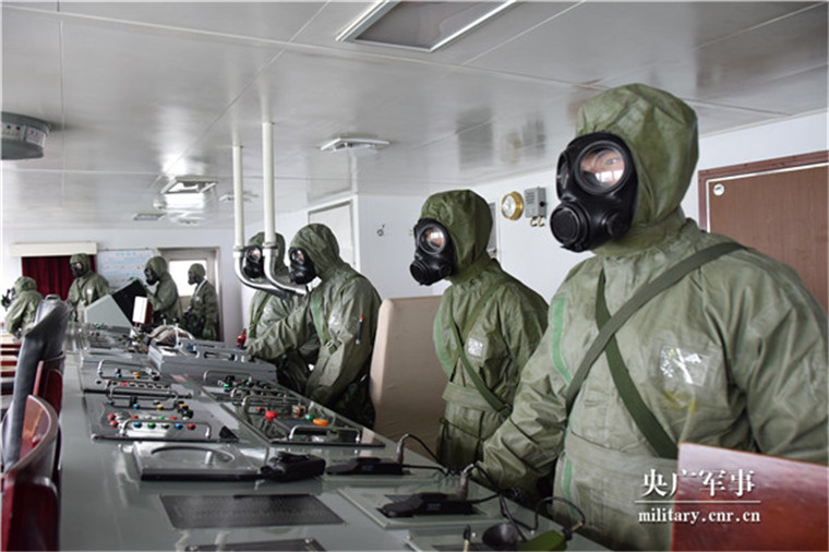 刚结束狭水道航行部署,导调组就下达特情,一架携带生化武器的敌机向编队高速来袭。在气温达到40度的动力舱内,四级军士长李小伟帮助记者穿上了防护服。