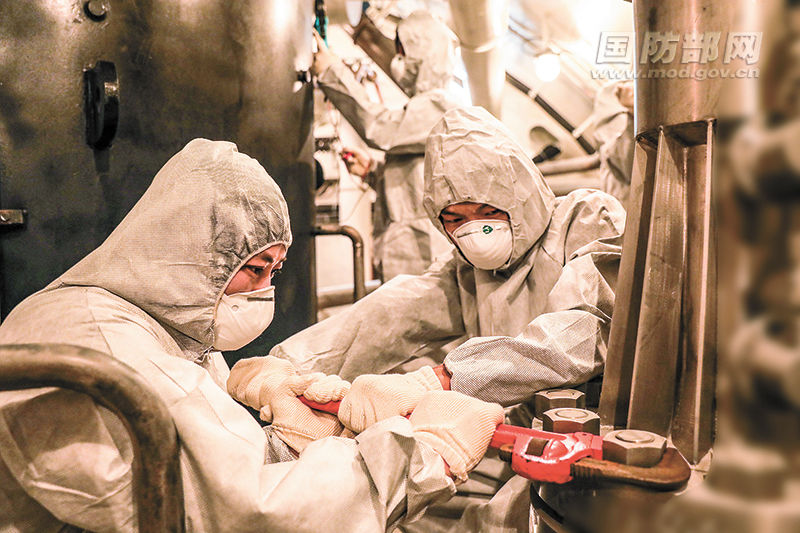 近日,海军某基地立足实战组织开展模拟舱室训练,设置险情难情,加大训练难度,着力提高官兵应急处置能力。班长张泽祥(左一)穿着厚重的防护服,进入温度高达50℃的舱室内抢修故障设备,顿时汗流浃背。新兵霍跃强(右一)见状冲进舱室,协助班长按规定时间完成了任务。