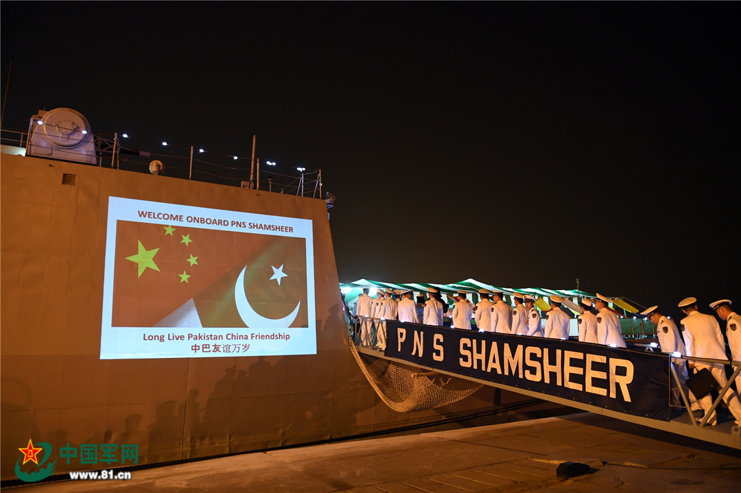 当地时间1月6日晚,巴基斯坦海军举行甲板招待会,参加“海洋卫士-2020”中巴海上联合演习的中方官兵代表登上巴方军舰进行热情交流。这是巴方军舰上用投影映射出中巴两国国旗和“中巴友谊万岁”。记者穆瑞林 摄