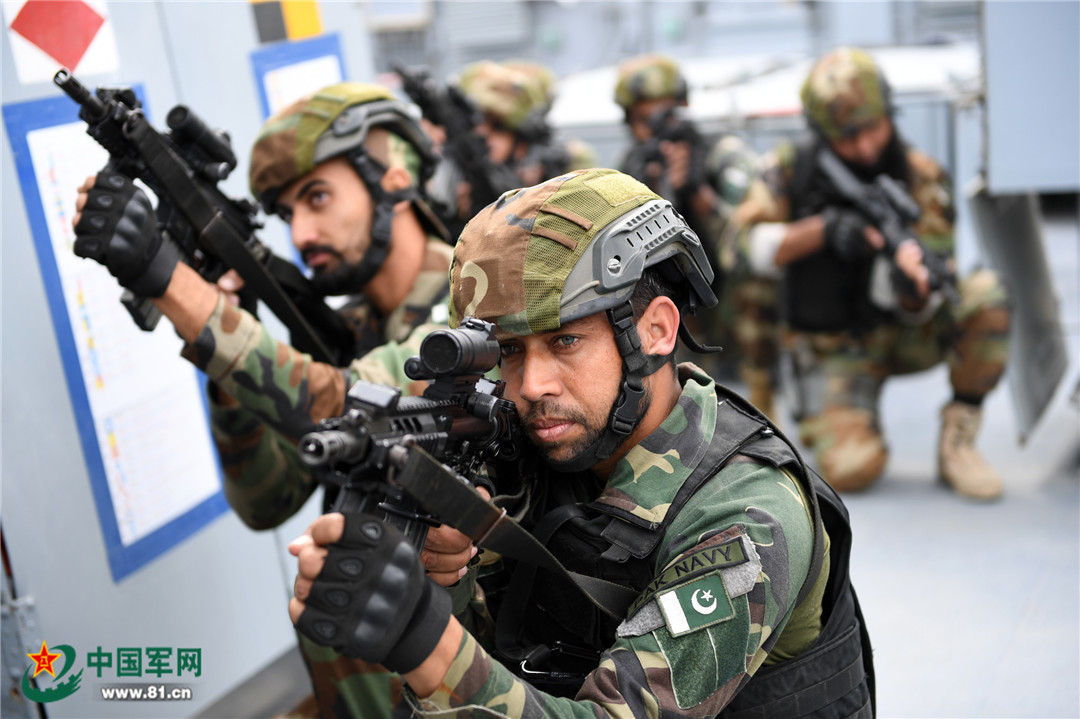 比如仅在7日上午,中巴海军就进行了近10项互动课目,包括:两军混编演练乘坐气垫艇抢滩登陆;我海军官兵登上巴海军沙贾汗号(SHAHJAHAN 186)驱逐舰观摩巴方临检拿捕演练;巴海军官兵登上运城舰观摩损害管制演练和战伤救护操演;与此同时,在巴海军战术学校,中巴官兵还就超视距目标打击程序等内容进行了交流。