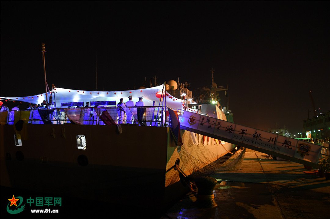 当地时间1月8日晚,巴方官兵参加了中方在舰上举行的甲板招待会。图为招待会现场。记者穆瑞林 摄