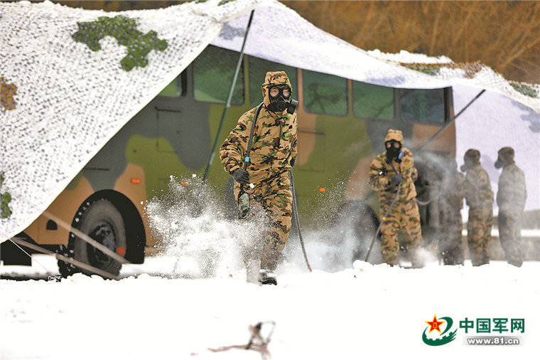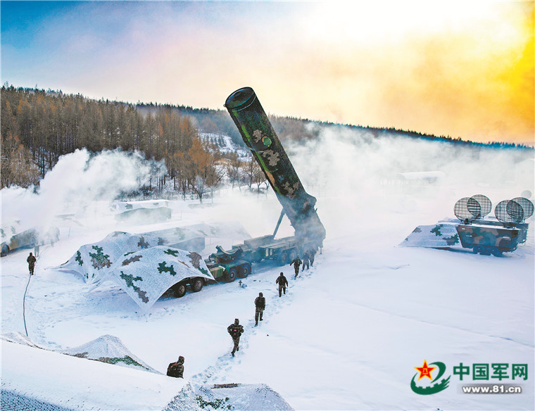“敌”空中侦察、道路受损、遭核生化袭击……一路行军,一路险象环生。面对复杂多变的“敌情”,指挥员沉着应对,时而指挥部队多路并进快速机动,时而依托密林雪野隐蔽伪装……上午11时,部队按时到达指定地域,随装温度计显示气温-26℃,但官兵并未休整,迅即投入开设发射阵地作业……