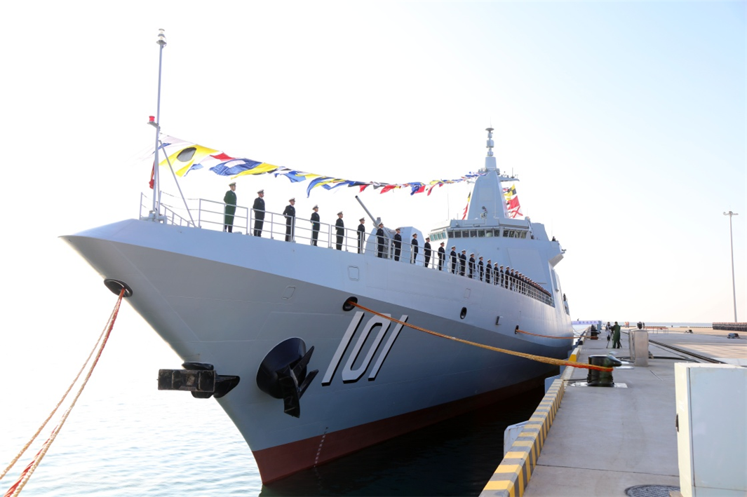 山东青岛,海鸥掠海低翔,顺着它们划出的弧线,所有目光聚焦在军港码头。一艘银灰色巨舰伏波静卧,巨大的“101”舷号跃入眼帘。向更高处望去,从舰艏到舰艉,满旗高悬。