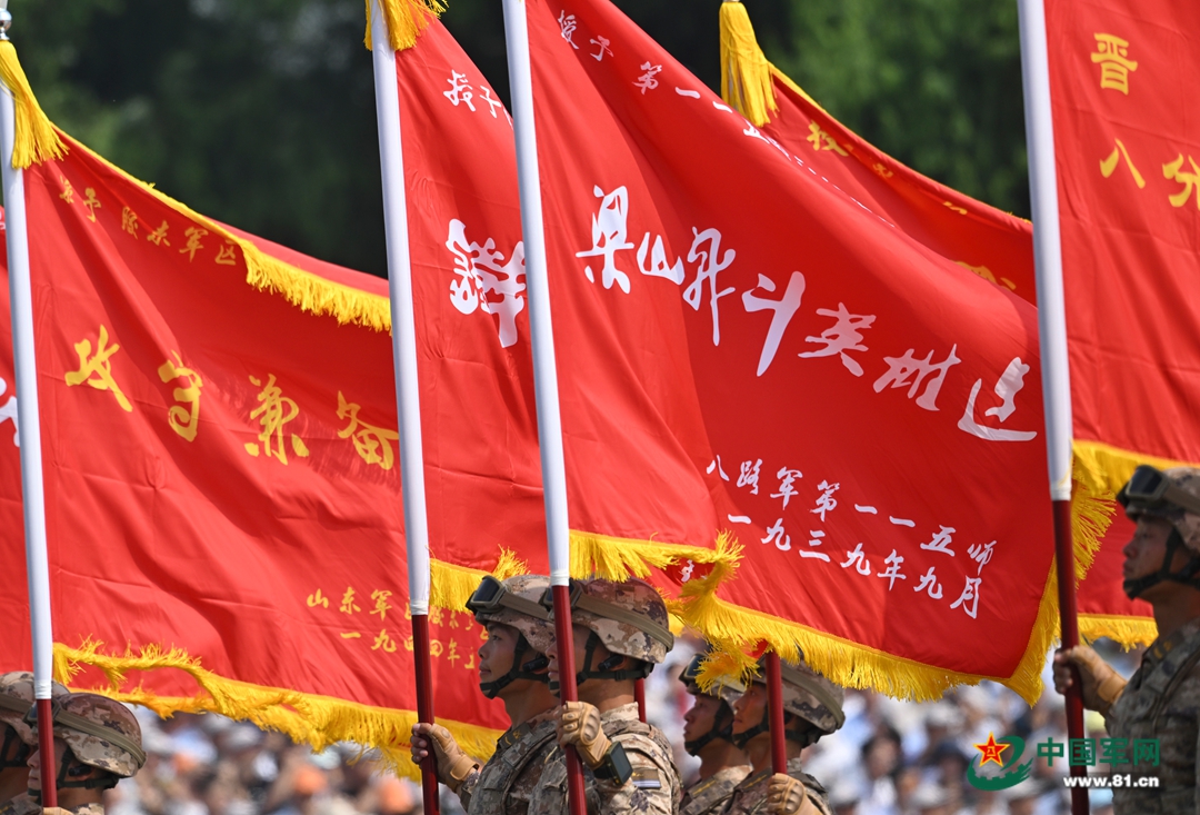 2025年9月3日,纪念中国人民抗日战争暨世界反法西斯战争胜利80周年大会在北京隆重举行。“梁山战斗英雄连”战旗列阵战旗方队接受检阅。新华社记者 刘金海 摄