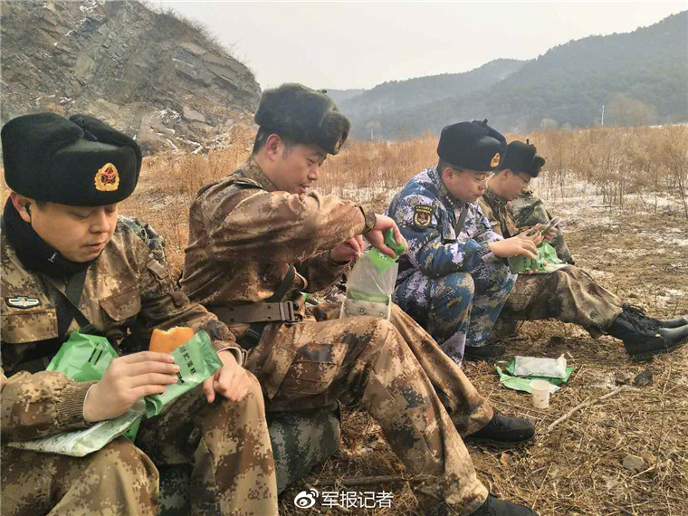 徒步急行至大休息地域已是午餐时间,与往年拉练不同,这次没有集中进行热食保障,而是利用单兵自热食品快速自我保障。记者在现场看到,大家迅速从背囊里掏出一袋09单兵自热食品,麻利的撕开外包装,首先将单兵无火焰自加热器袋的封口撕开,配备的水袋向加热器袋里注入标准水量,然后将自热食品翻转后放平,并将加热器袋口向上回折,每5分钟将自热食品翻转一次,持续15-20分钟,自热米饭或面条就熟了,辅以配带的蛋糕、软体黄桃罐头、牛肉香肠及速溶饮料,吃起来也挺香。