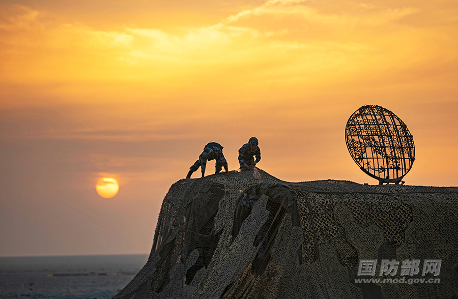 夕阳下,官兵快速进行伪装防护。