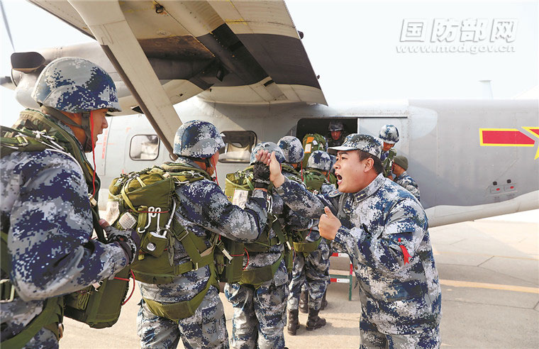 背伞包、挂腿钩、掖拉绳……在投放员的指挥下,新兵们有条不紊地披挂降落伞。“好!”空降空投教研室主任王迎春一边检查新兵们的伞具,一边竖起大拇指为他们加油鼓劲。
