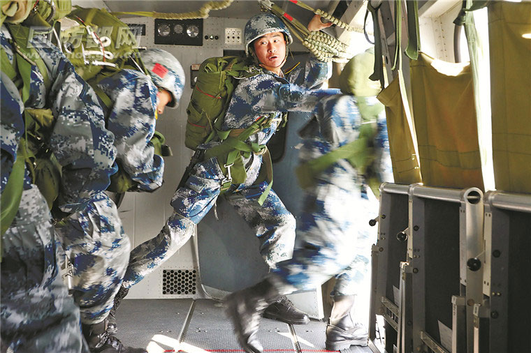 “跳!跳!跳!”当机舱内的跳伞信号响起,教员指挥新兵们依次纵身跃出舱门。顿时,空中绽放朵朵洁白的伞花。大约2分钟后,新兵们陆续成功着陆。