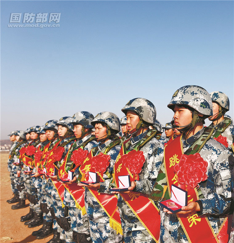 参训女兵圆满完成训练后,身披绶带红花,获得首次跳伞纪念证章。