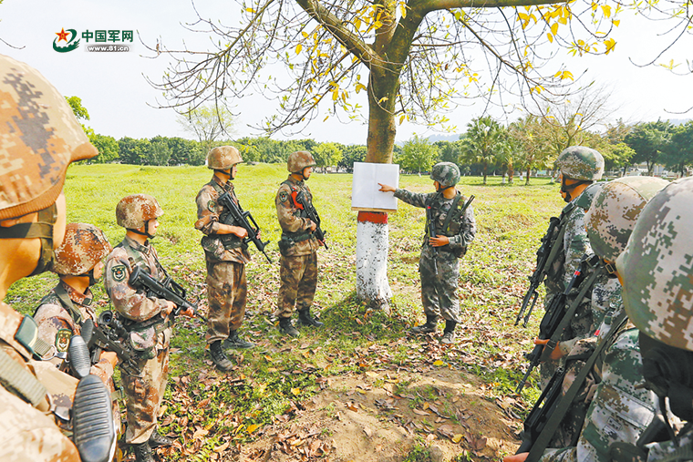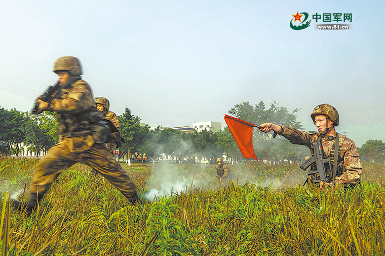 红方封控组组长、中士高强(右一)临机指挥组员们向“蓝军班”发起进攻。
