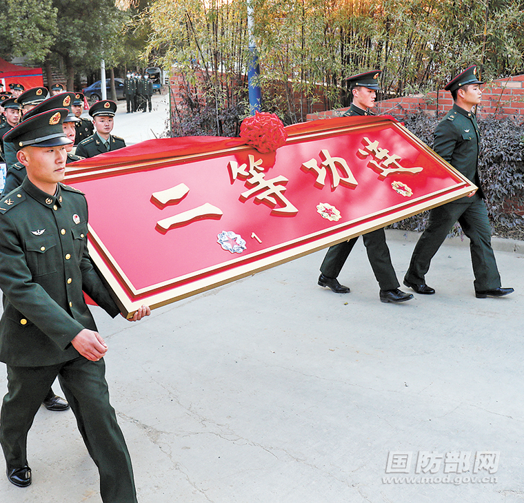 表彰大会后,官兵喜领“二等功连”牌匾回连。作者提供