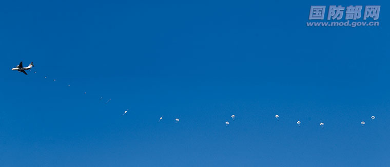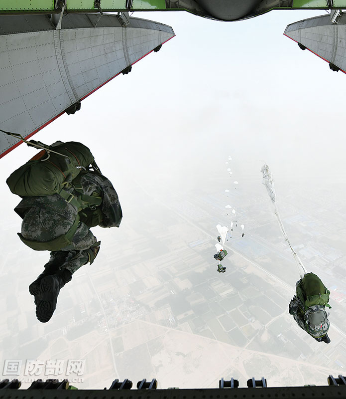 初夏,豫中腹地,第82集团军某旅联合空降兵某旅开展运输机伞降实跳训练。