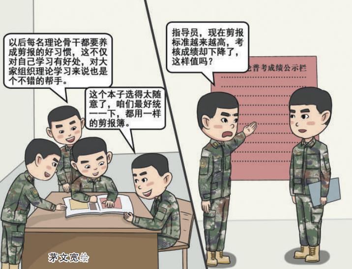 事后,旅里专门针对抓好理论学习提出“不搞形式主义、不搞门面工程、不搞盲目攀比、不搞层层加码”等明确要求。如今,王一品不再为提升剪报标准而伤脑筋,大伙心思和精力向理论学习本体回归,也让连队很快在新一轮的理论考核中打了“翻身仗”。