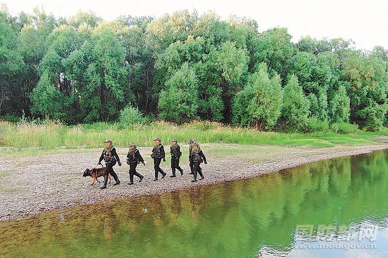巡逻官兵与军犬行走在蚊虫肆虐的巡逻路上。张聪聪摄