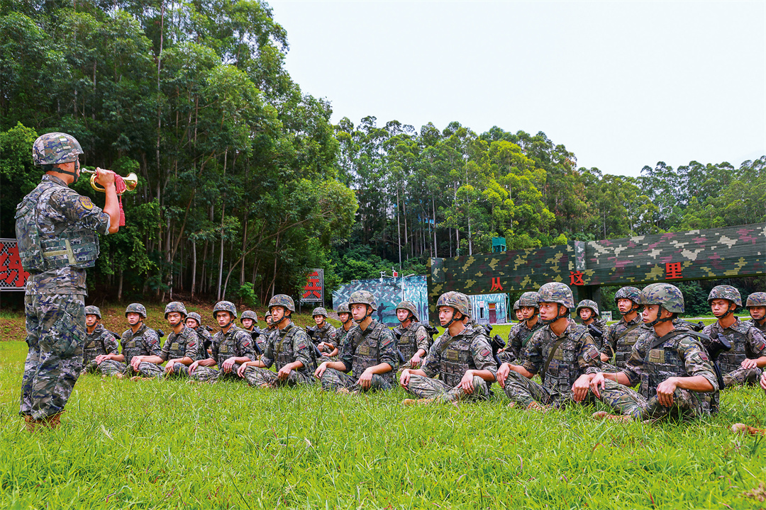 武警广西总队机动支队司号员刘顺波(左一)利用训练间隙吹响军号,为战友讲述司号员的红色故事。刘明 摄