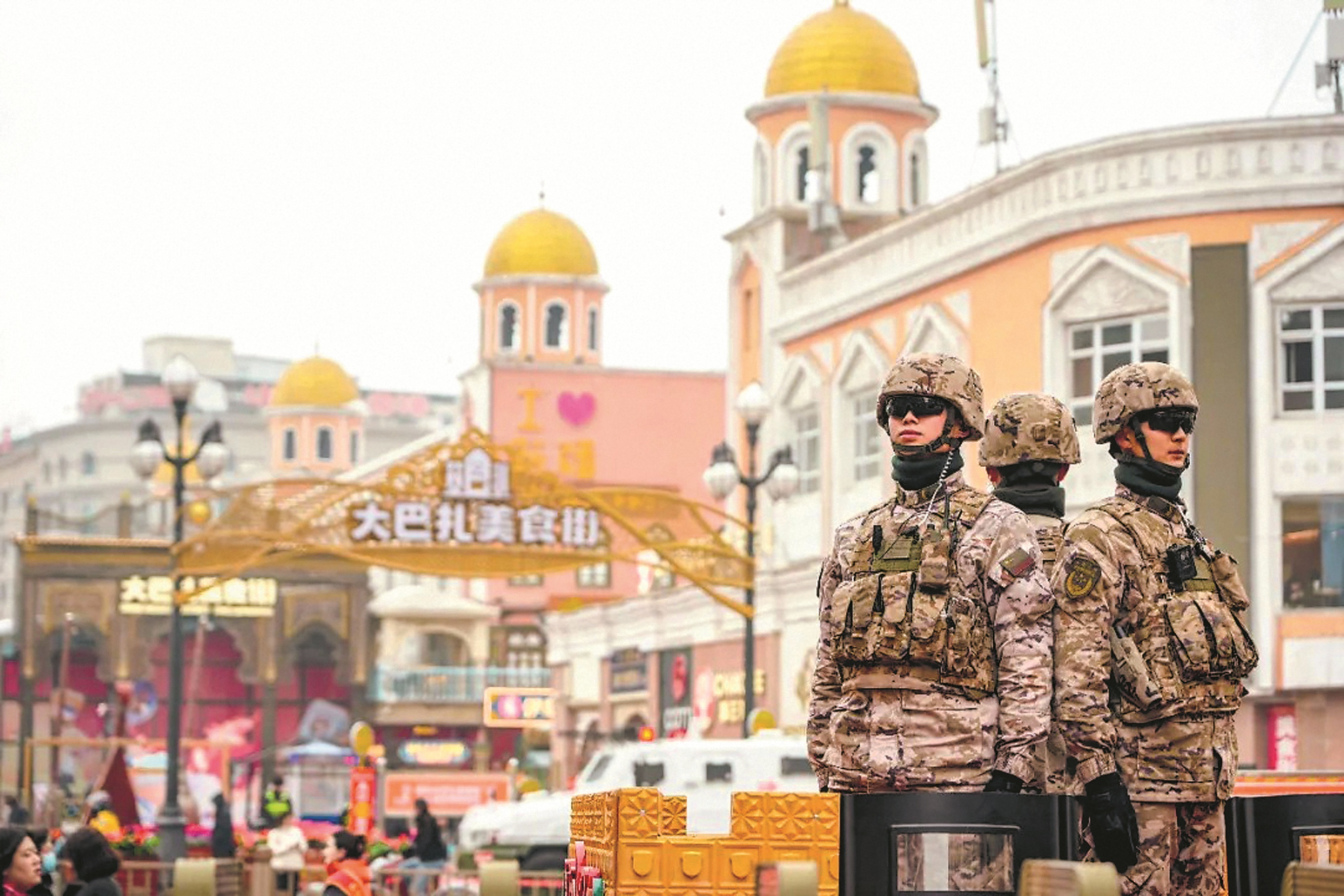 武警新疆总队某支队防暴巡逻车四中队哨兵在乌鲁木齐市新疆国际大巴扎哨位执勤。董虎 摄