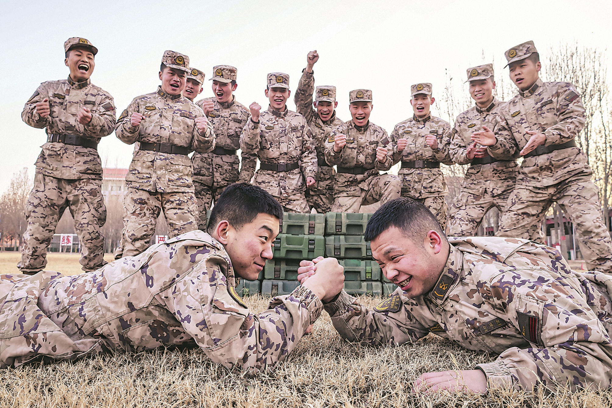 武警河北总队衡水支队某中队训练间隙组织活动,官兵们鼓劲喝彩。彭晨 摄