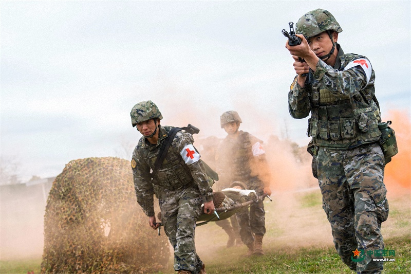 参训官兵展开救援,对“伤员”进行搬运。施晨洲 摄