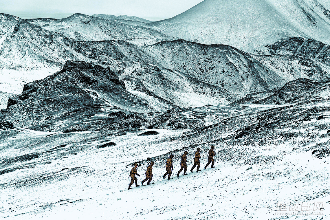 一阵寒风吹过,官兵们对阵地周边展开新一轮巡逻。身着新式作训服的官兵与皑皑雪山融为一体,俨然一幅壮美的水墨画。