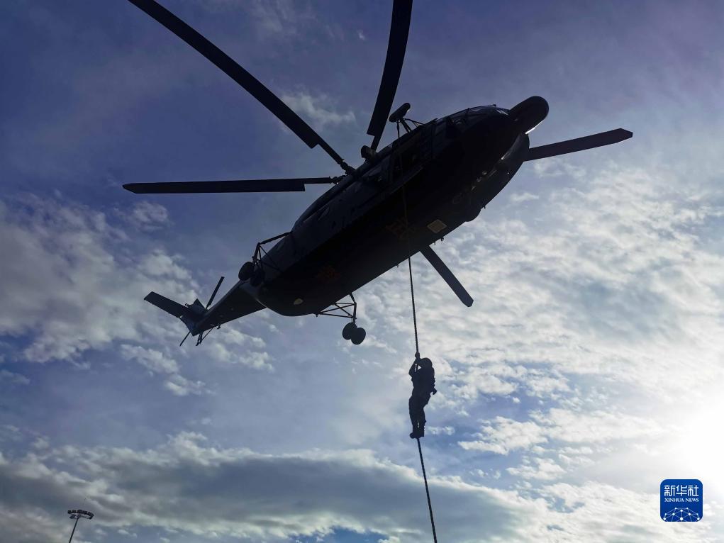 在实战化演练中,武警部队第二机动总队某支队五中队官兵从直升机上快速索降(2022年7月6日摄)。新华社发(杨延国 摄)
