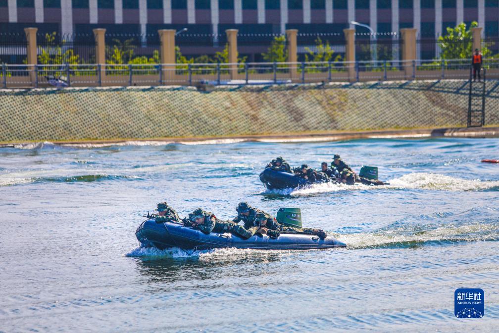 在实战化演练中,武警部队第二机动总队某支队五中队官兵驾乘橡皮艇追击(2023年7月11日摄)。新华社发(周小波 摄)