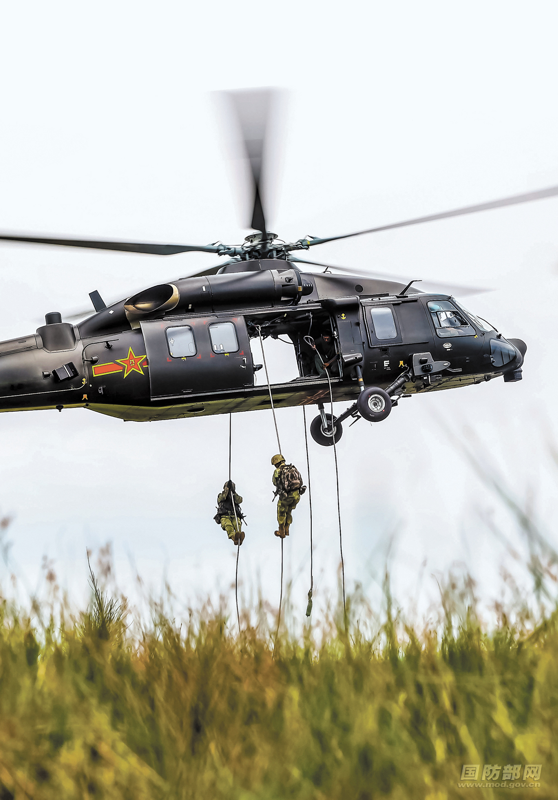 待目标区域开辟机降场后,数架运输直升机低空突入“战场”,采取索降、机降等方式投送兵力。官兵从机舱两侧快速离机降落,对“敌”纵深目标发起攻击。